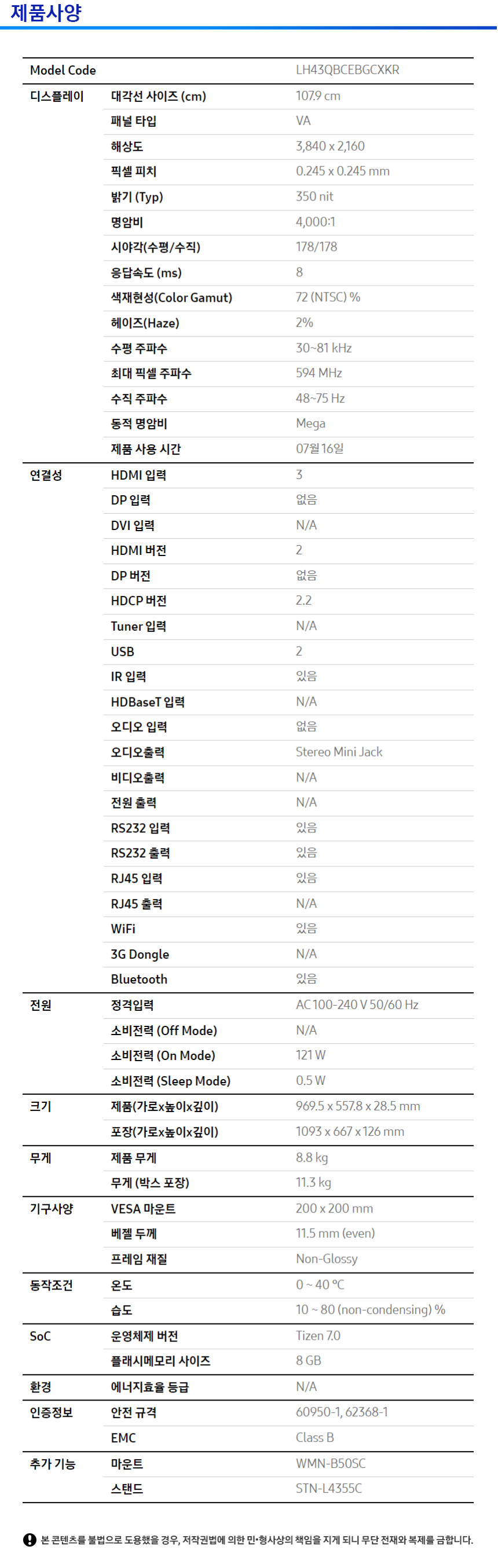 43인치 4K 사이니지 광고모니터 LH43QBCEBGCXKR